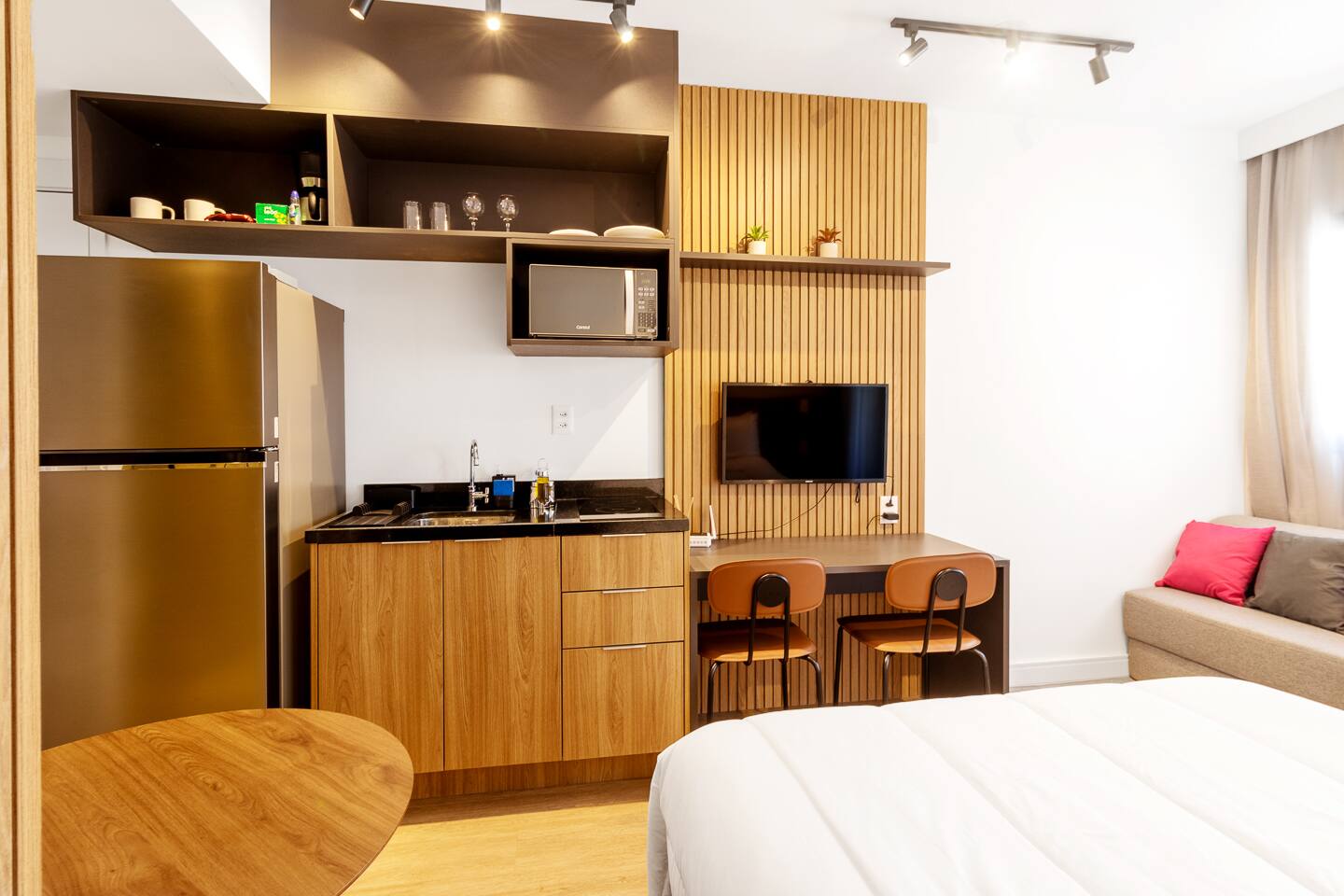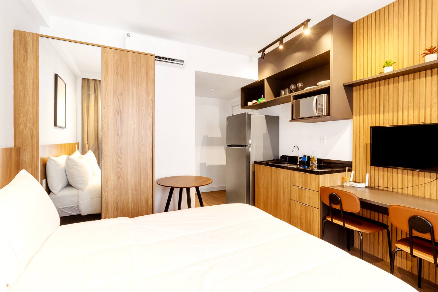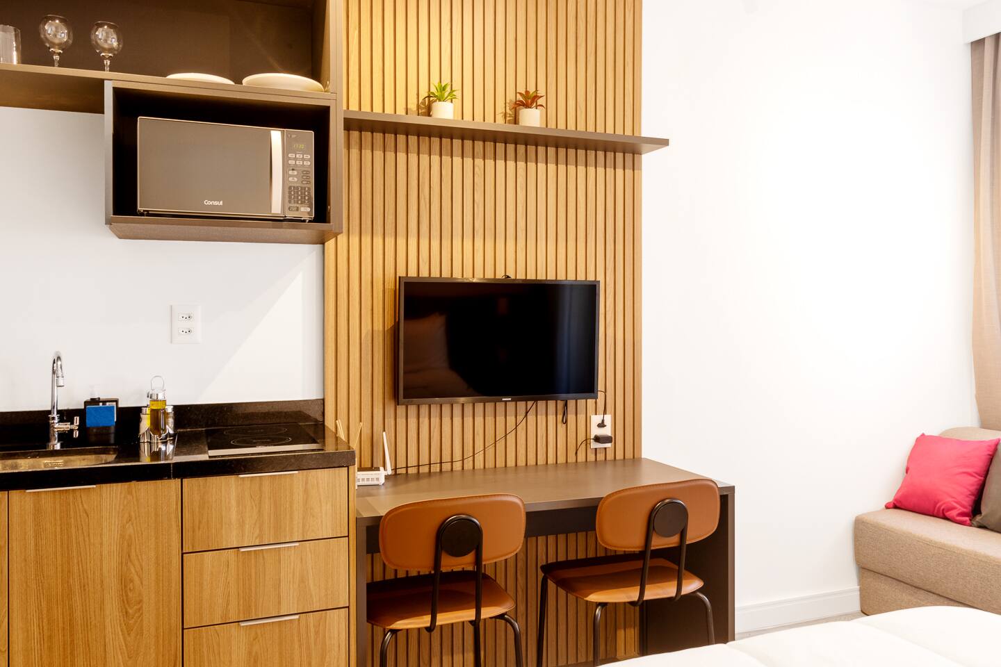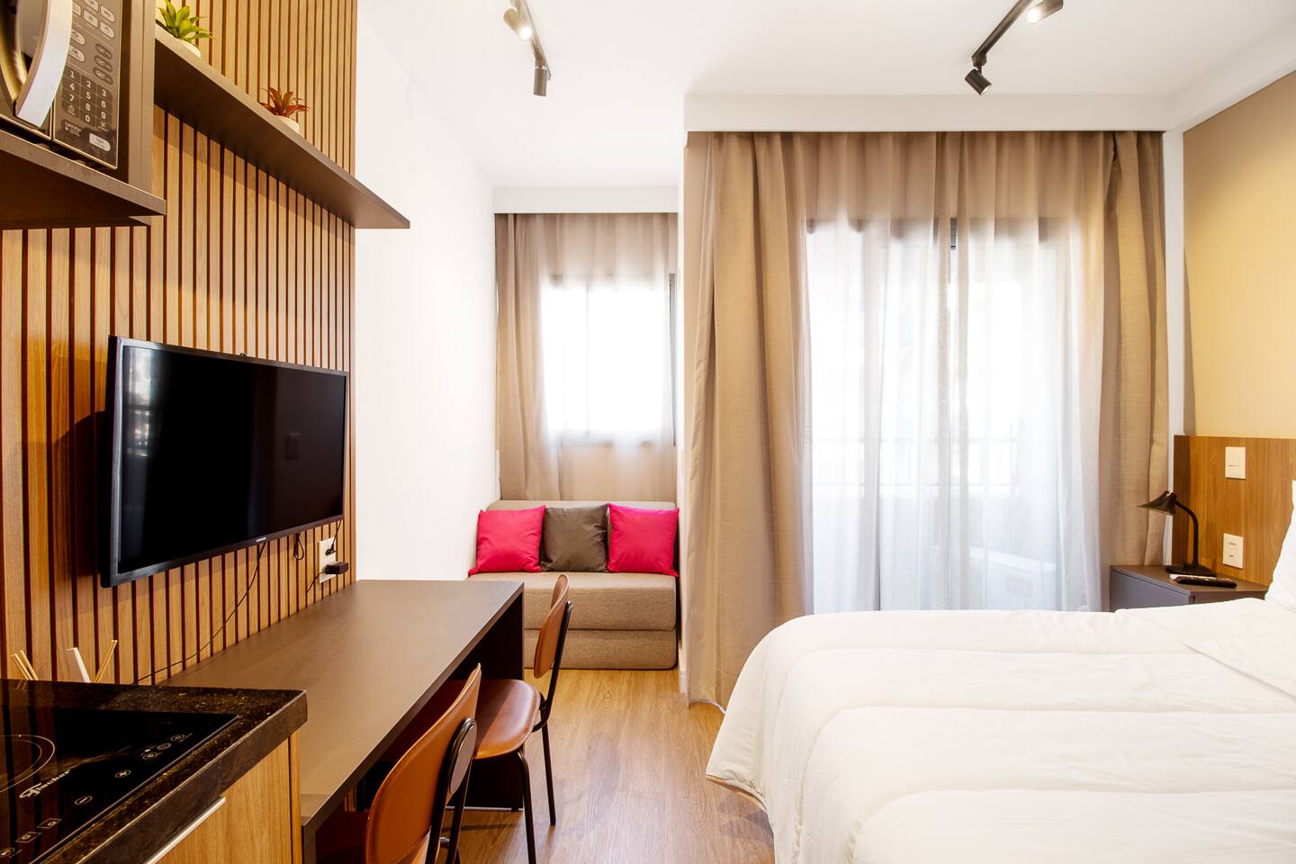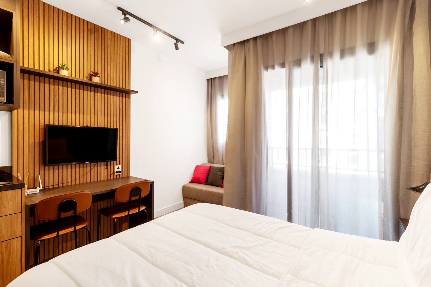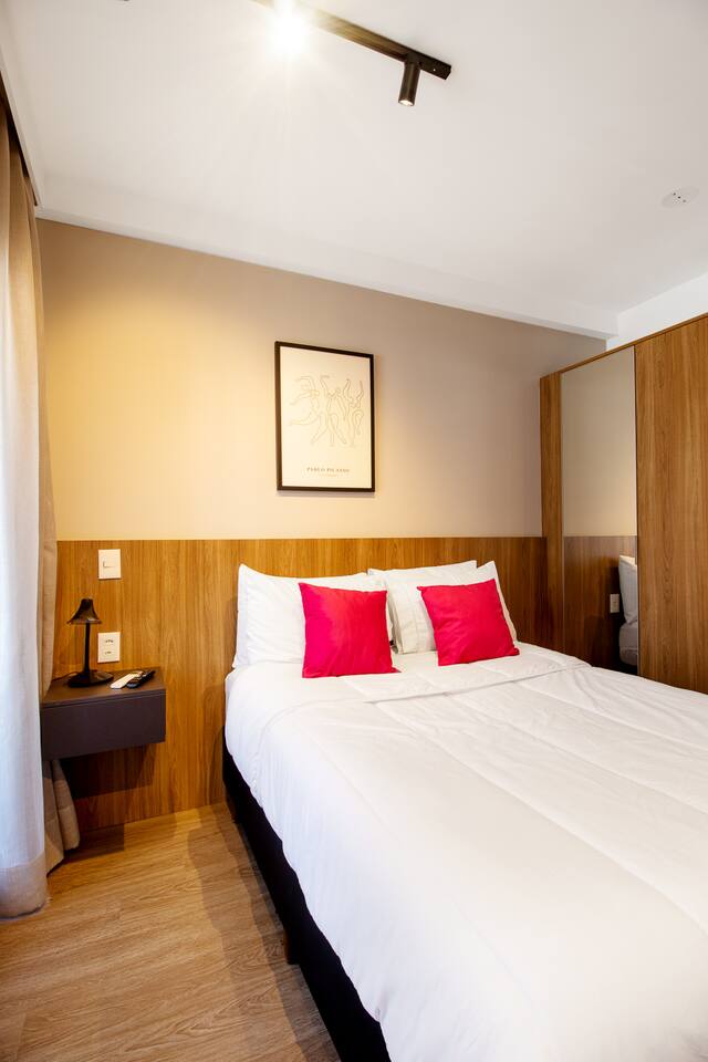 This 27m² unit is a model of vertical efficiency. High above the city on the 17th floor, it offers a quiet retreat from the bustling streets below. The Queen-size bed offers a restful sanctuary, while the single sofa bed is perfect for a child or guest. Long-stay guests will love the "On" building's ecosystem: a 24h mini-market for last-minute groceries, a dedicated pet place, and a professional laundry room. The kitchen is fully functional for home-cooked meals, and the balcony provides a safe, fresh-air escape. We provide professional cleaning products at your disposal, ensuring your home remains pristine throughout your stay in Vila Olímpia.