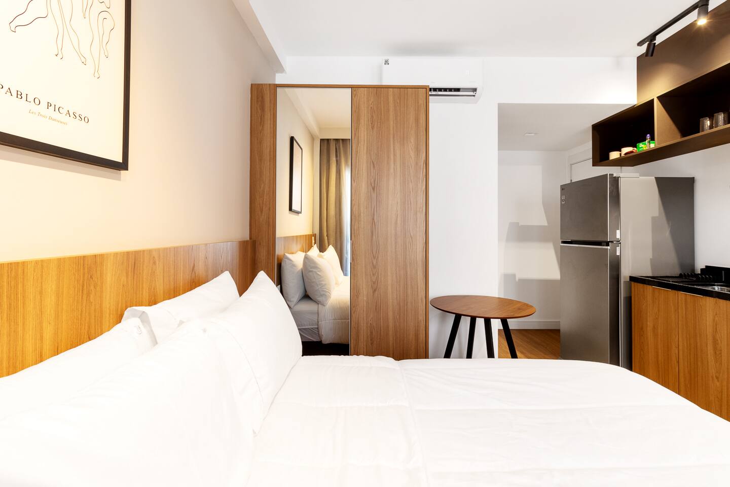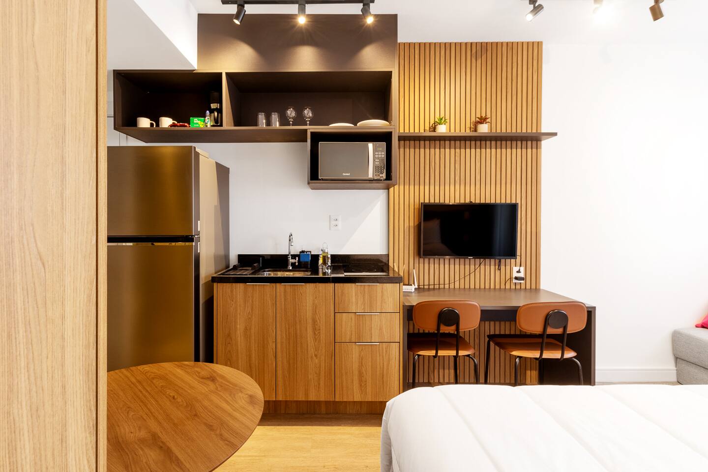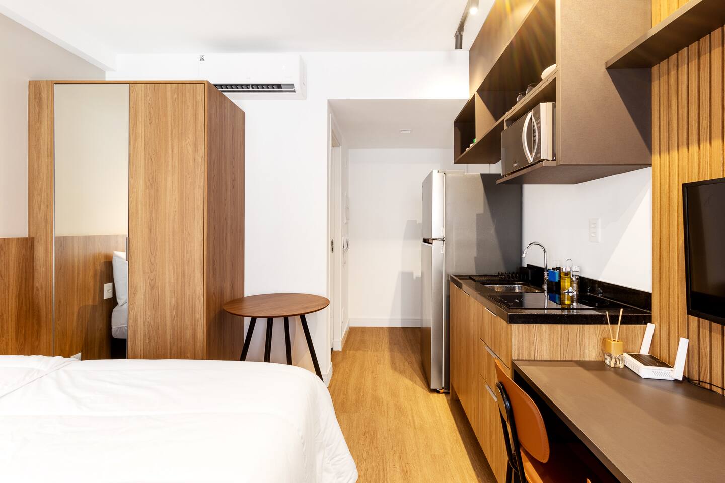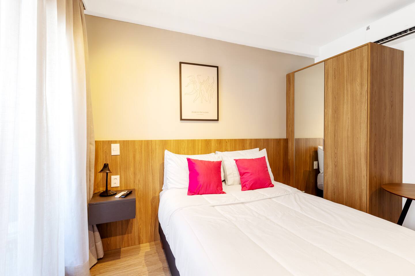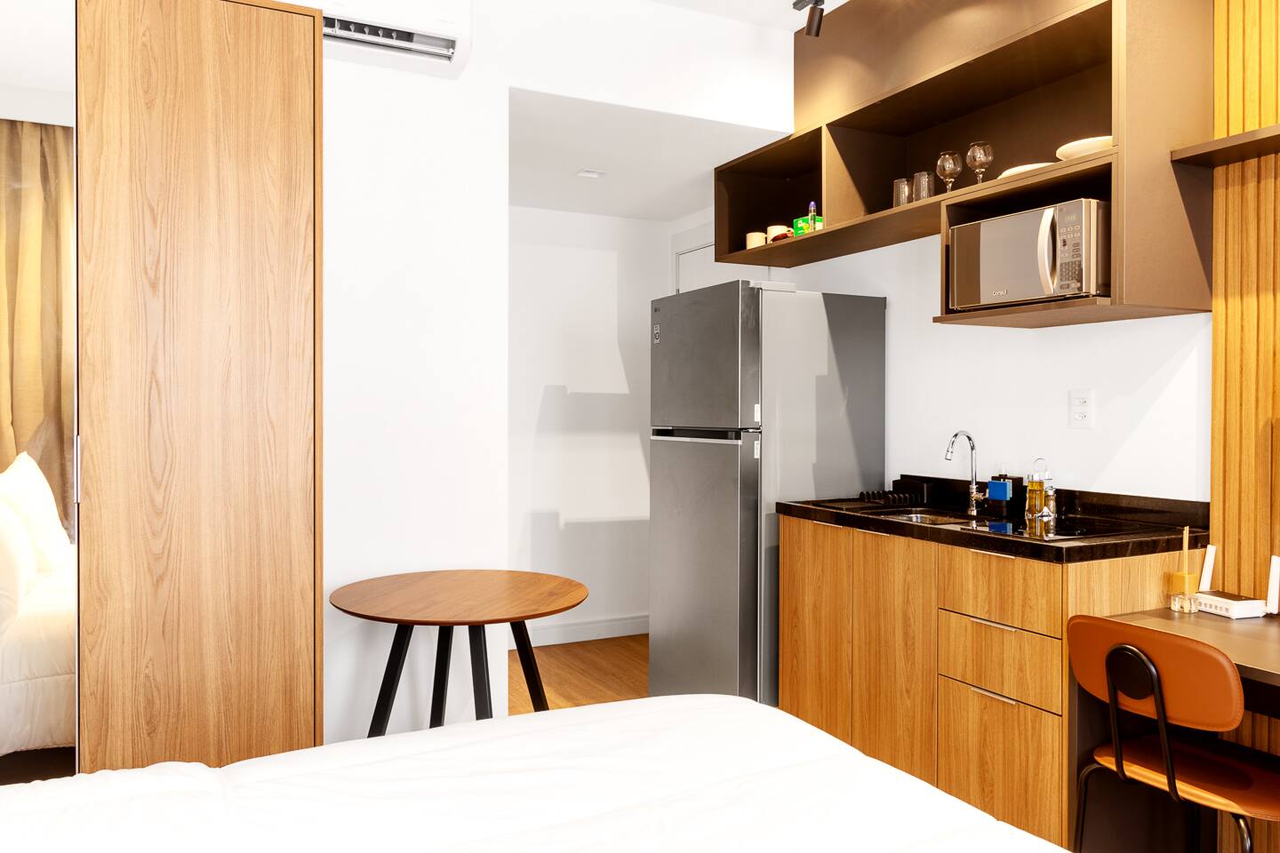 This 27m² unit is a model of vertical efficiency. High above the city on the 17th floor, it offers a quiet retreat from the bustling streets below. The Queen-size bed offers a restful sanctuary, while the single sofa bed is perfect for a child or guest. Long-stay guests will love the "On" building's ecosystem: a 24h mini-market for last-minute groceries, a dedicated pet place, and a professional laundry room. The kitchen is fully functional for home-cooked meals, and the balcony provides a safe, fresh-air escape. We provide professional cleaning products at your disposal, ensuring your home remains pristine throughout your stay in Vila Olímpia.