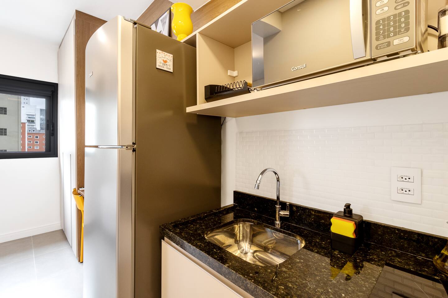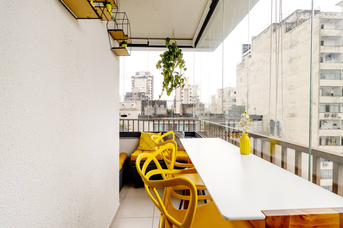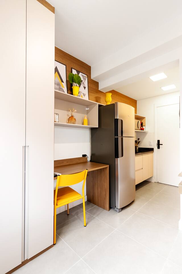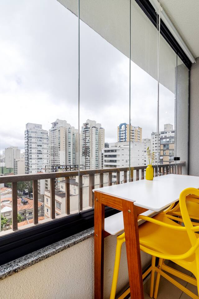 Welcome to your premium São Paulo experience. This brand-new, 23m² designer studio blends the vibrant energy of Rua Augusta with the high-end comfort of Becker Studios Rentals. Featuring a unique yellow-themed decor and a stunning glass-enclosed balcony, this space is perfect for solo travelers, couples, or small groups of three. Enjoy the best views of the city in a space that is as quiet as it is central, thanks to our specialized acoustic treatment. Start your day with a Nespresso and a view!