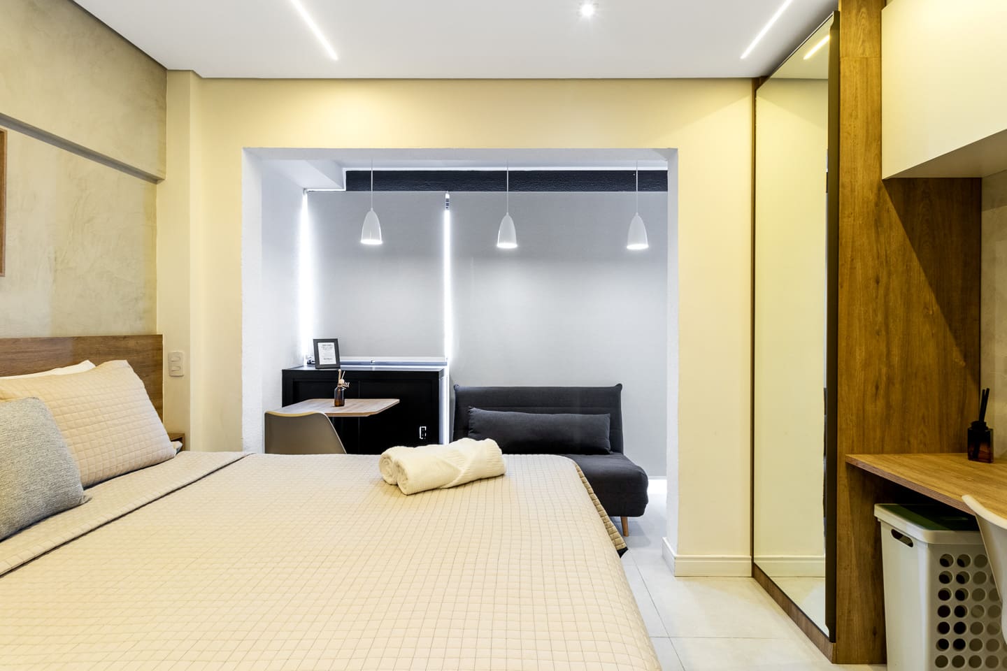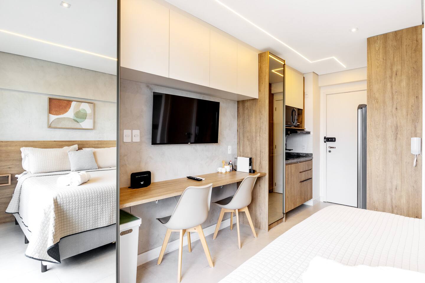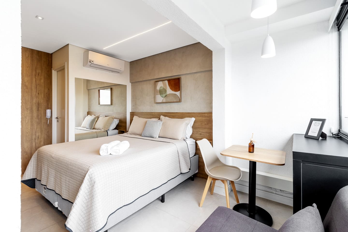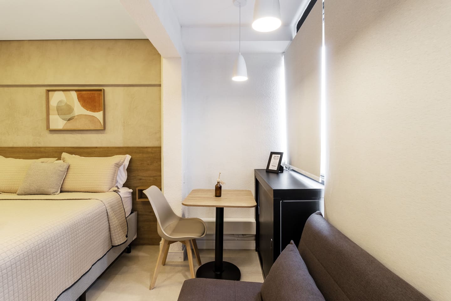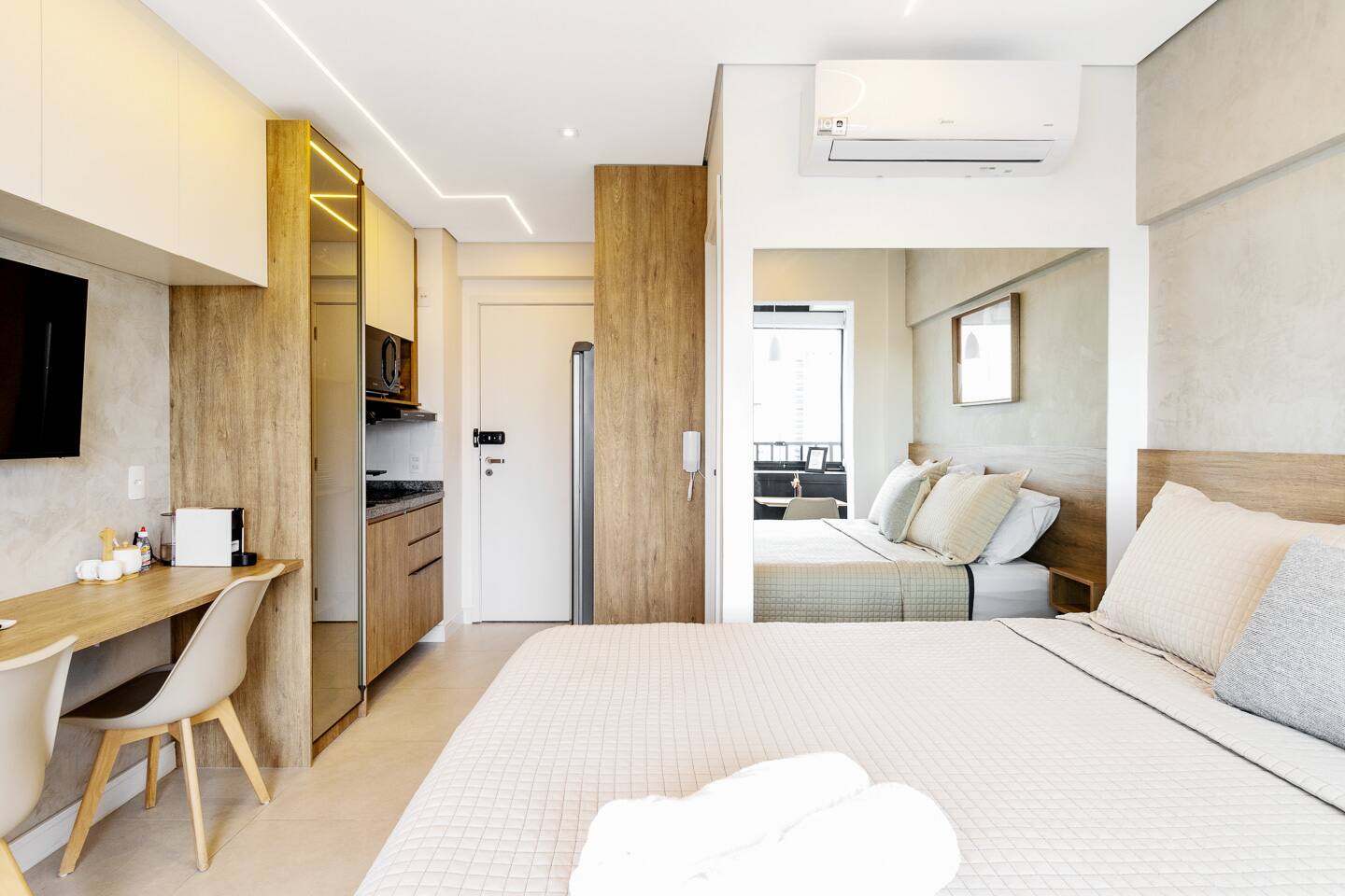Thoughtfully designed, this 27m² studio makes great use of space. It features a luxurious Queen bed and a versatile single sofa bed, accommodating up to 3 guests comfortably. The modern décor creates a bright, inviting atmosphere. Equipped with a smart TV and a functional kitchenette, it provides the perfect balance of hotel-like luxury and the comforts of a private apartment.
