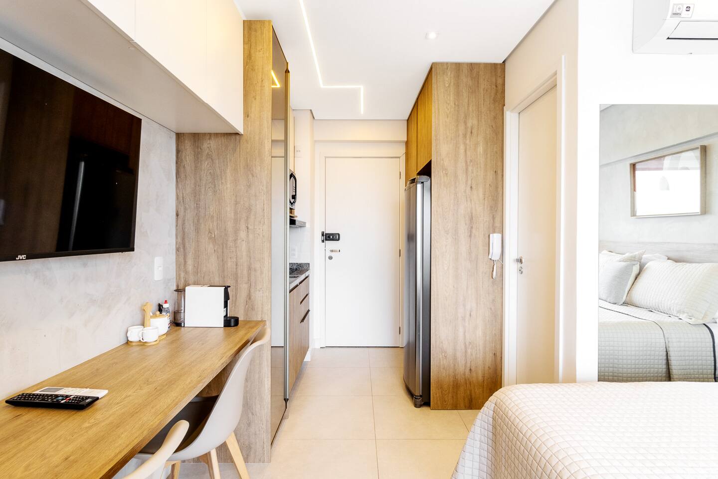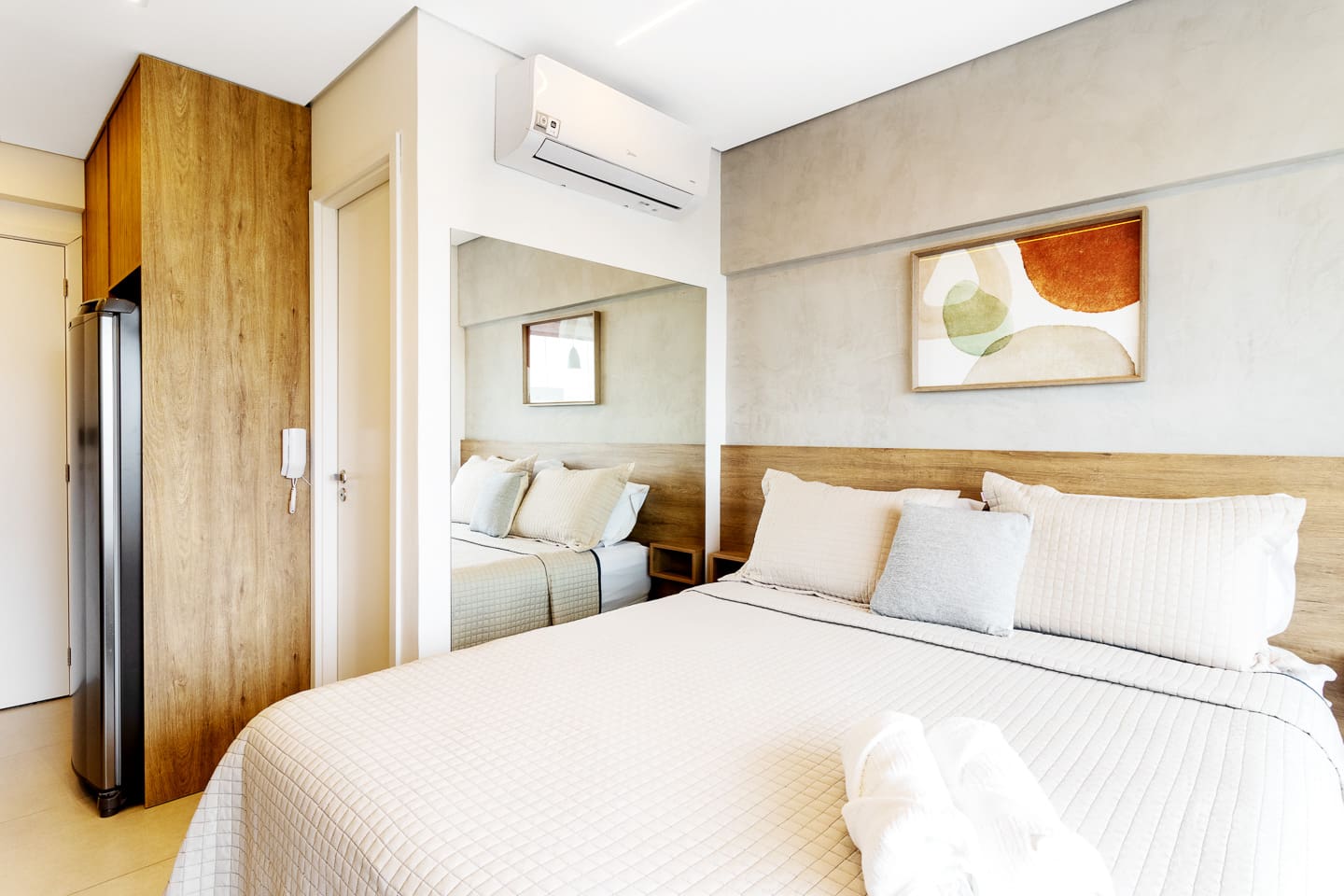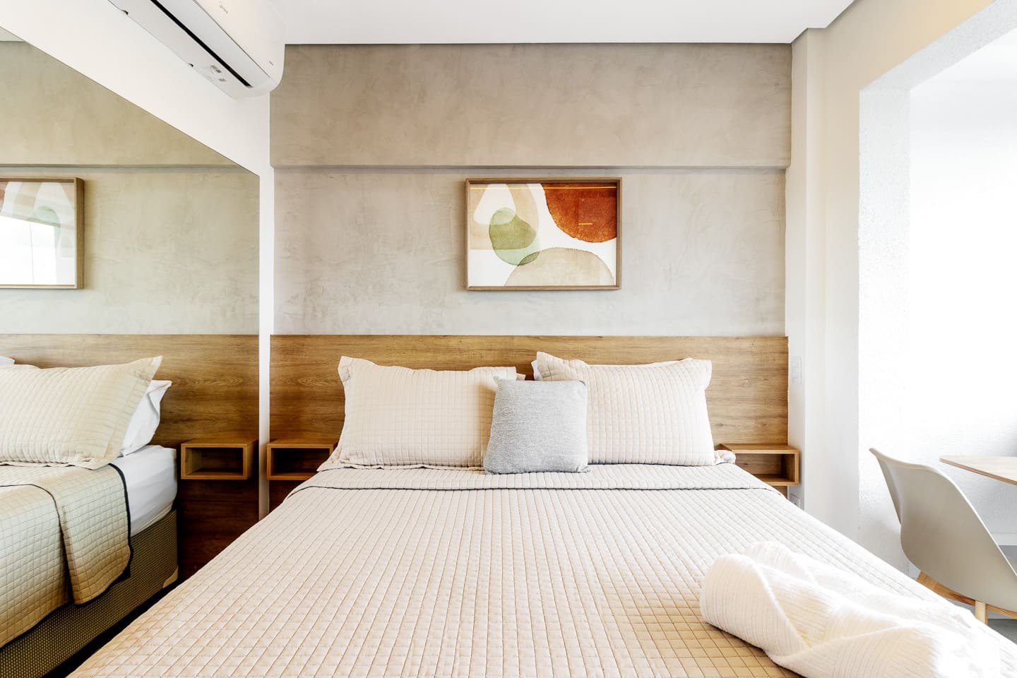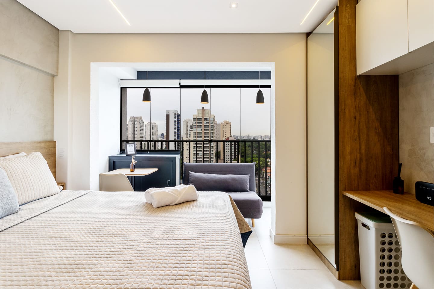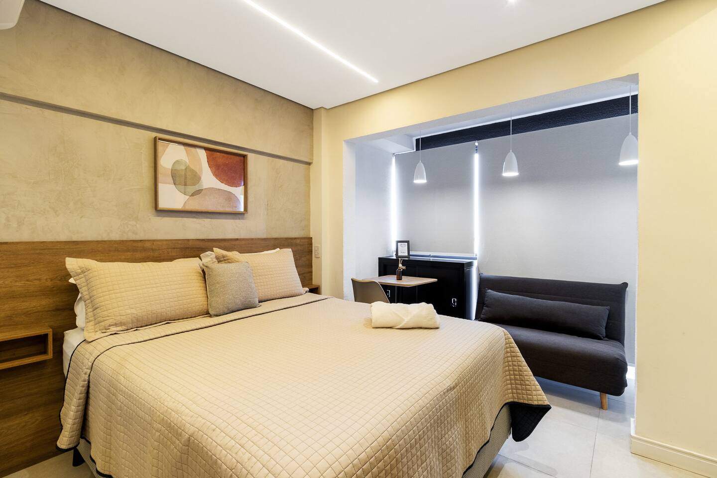Thoughtfully designed, this 27m² studio makes great use of space. It features a luxurious Queen bed and a versatile single sofa bed, accommodating up to 3 guests comfortably. The modern décor creates a bright, inviting atmosphere. Equipped with a smart TV and a functional kitchenette, it provides the perfect balance of hotel-like luxury and the comforts of a private apartment.