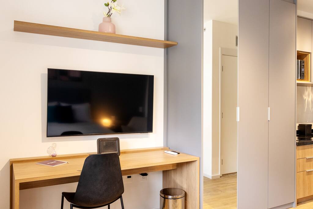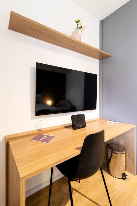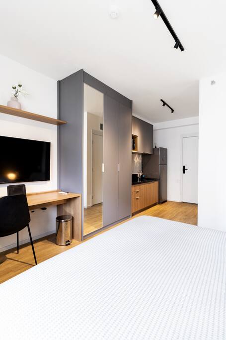 Where Function Meets Comfort We have optimized every inch of this modern studio to support your lifestyle. For Work: Power through your emails with our high-speed fiber optic Wi-Fi and a dedicated, comfortable workspace. The environment is quiet, bright, and conducive to focus. For Relaxation: Transition effortlessly into downtime. The studio features a plush Queen-size bed with premium linens, blackout curtains for deep sleep, and a Smart TV for your favorite series. The fully equipped kitchen allows for quick business breakfasts or intimate dinners at home.