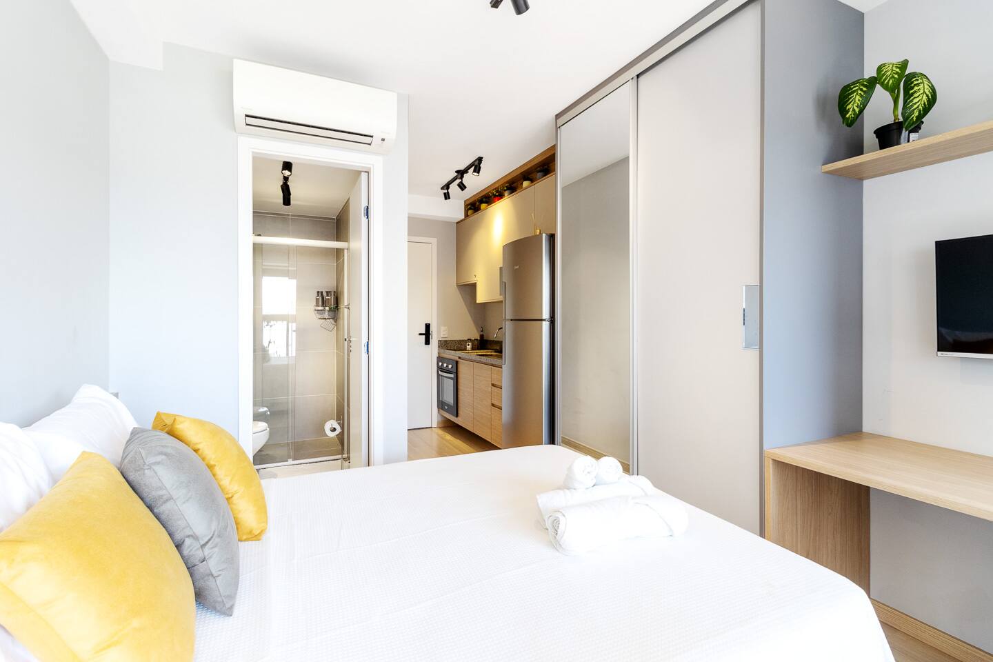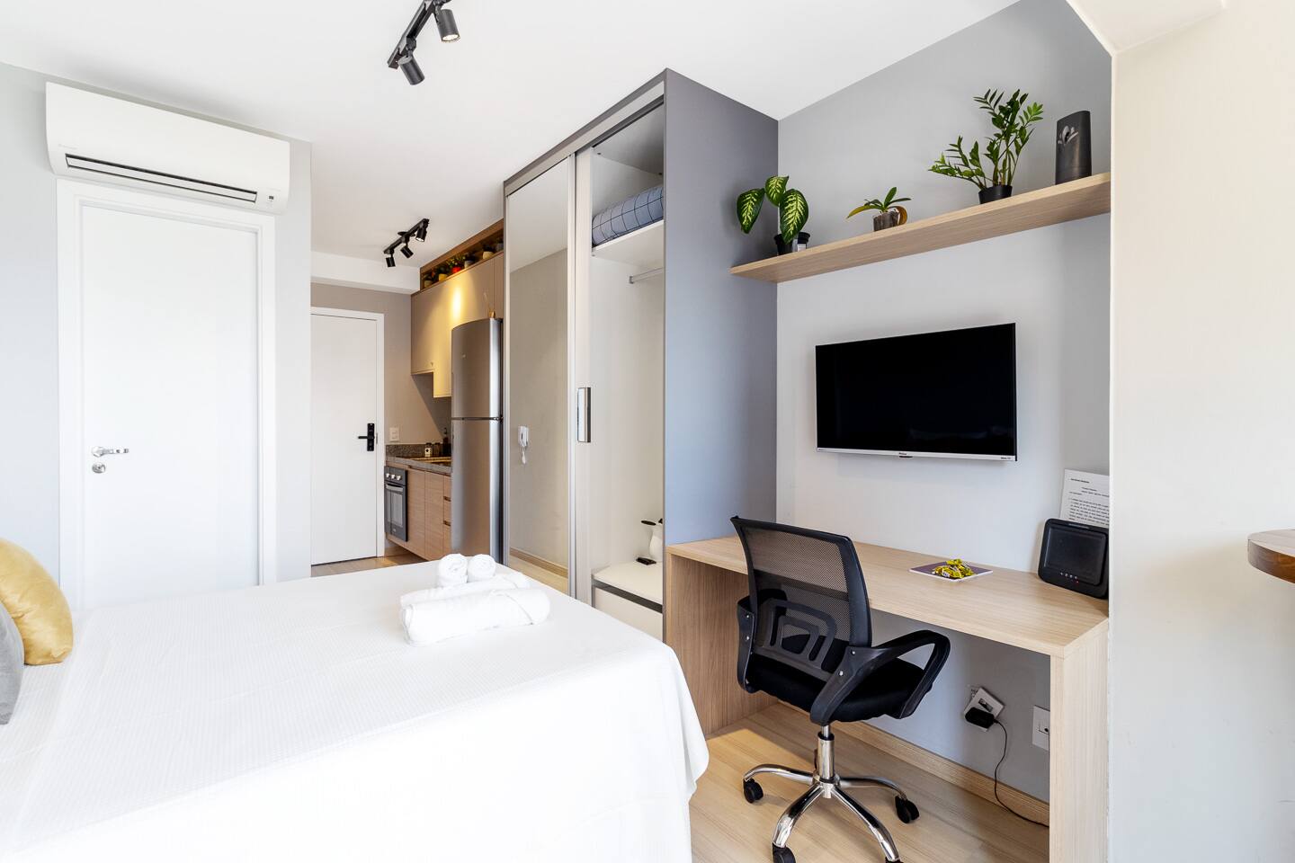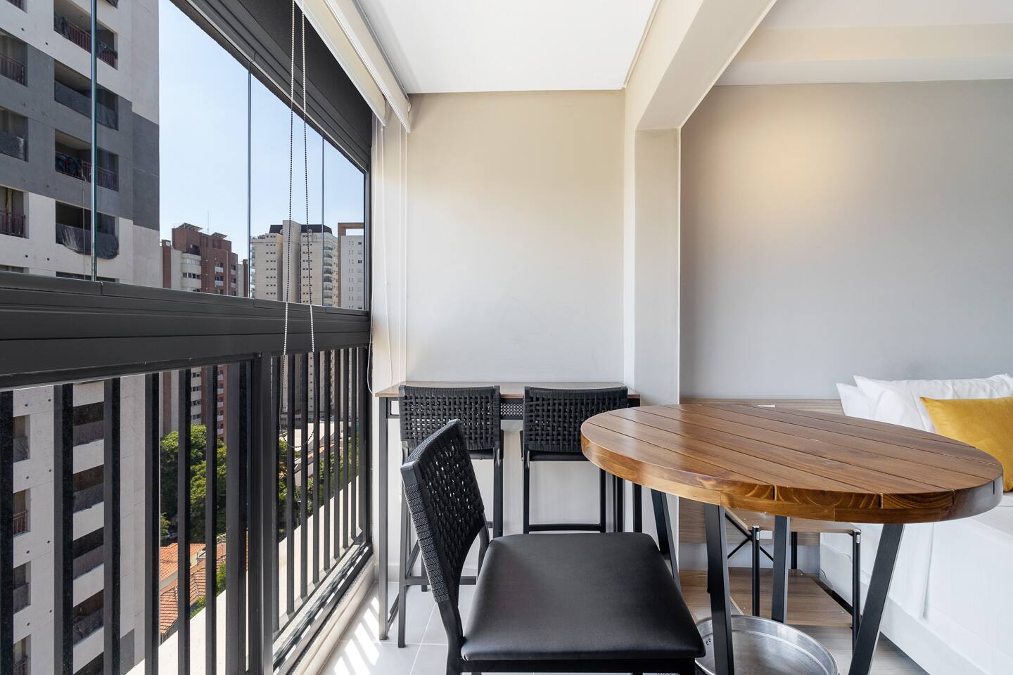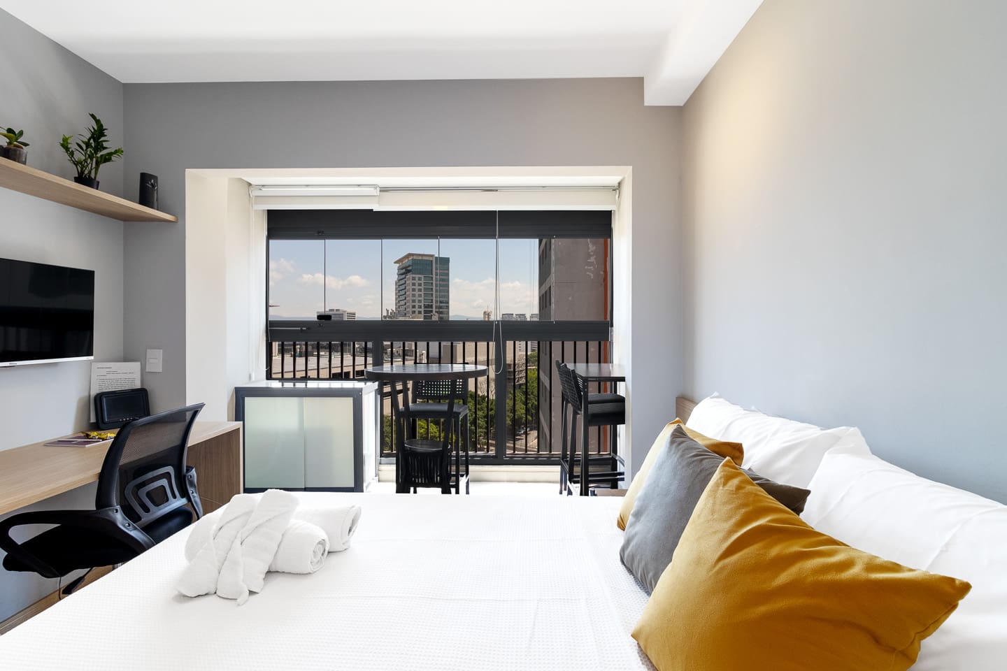 This 27m² studio is a masterpiece of urban design, optimized for both productivity and relaxation. Sleep like royalty in a plush double bed dressed in first-class 100% cotton linens. The layout features a dedicated workspace with a desk for your focus hours, plus two high dining tables, offering versatility for meals or casual meetings. The full kitchen is a chef's delight, boasting a complete oven, a built-in water filter for your convenience, and elegant wine glasses ready for a toast on the balcony. Every detail, from the ambient lighting to the premium finishes, has been curated to provide a superior living experience.
