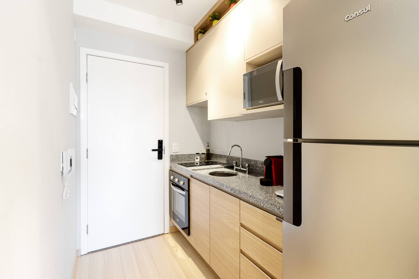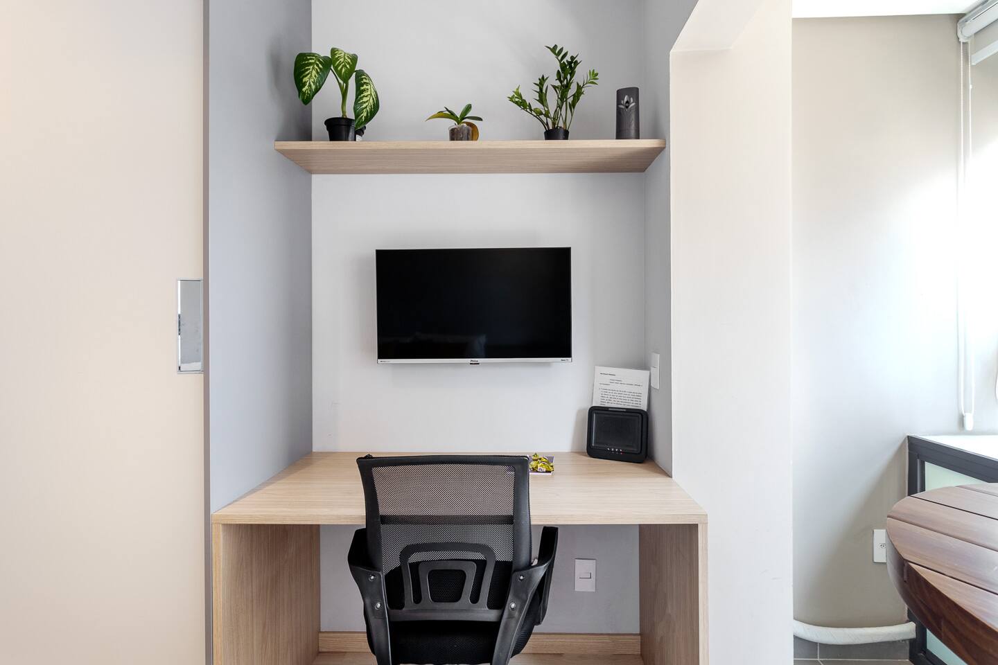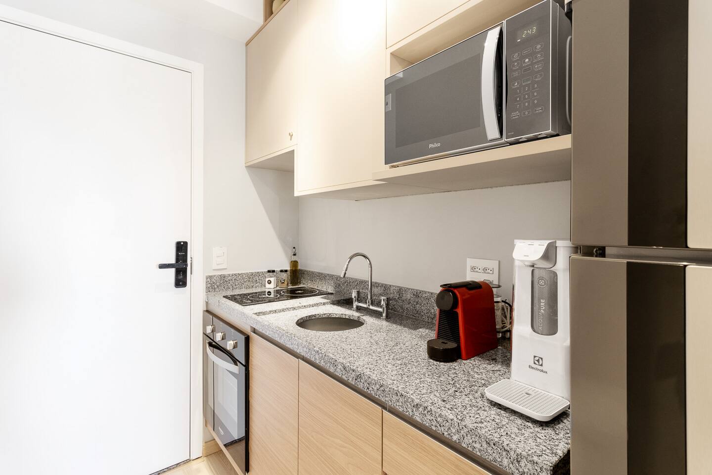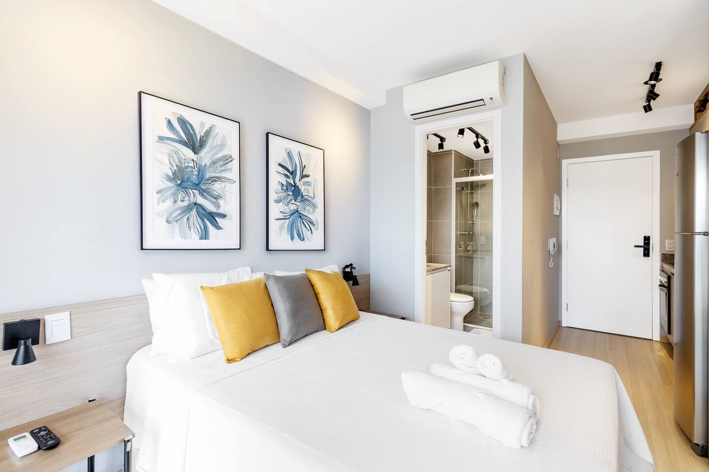 This 27m² studio is a masterpiece of urban design, optimized for both productivity and relaxation. Sleep like royalty in a plush double bed dressed in first-class 100% cotton linens. The layout features a dedicated workspace with a desk for your focus hours, plus two high dining tables, offering versatility for meals or casual meetings. The full kitchen is a chef's delight, boasting a complete oven, a built-in water filter for your convenience, and elegant wine glasses ready for a toast on the balcony. Every detail, from the ambient lighting to the premium finishes, has been curated to provide a superior living experience.