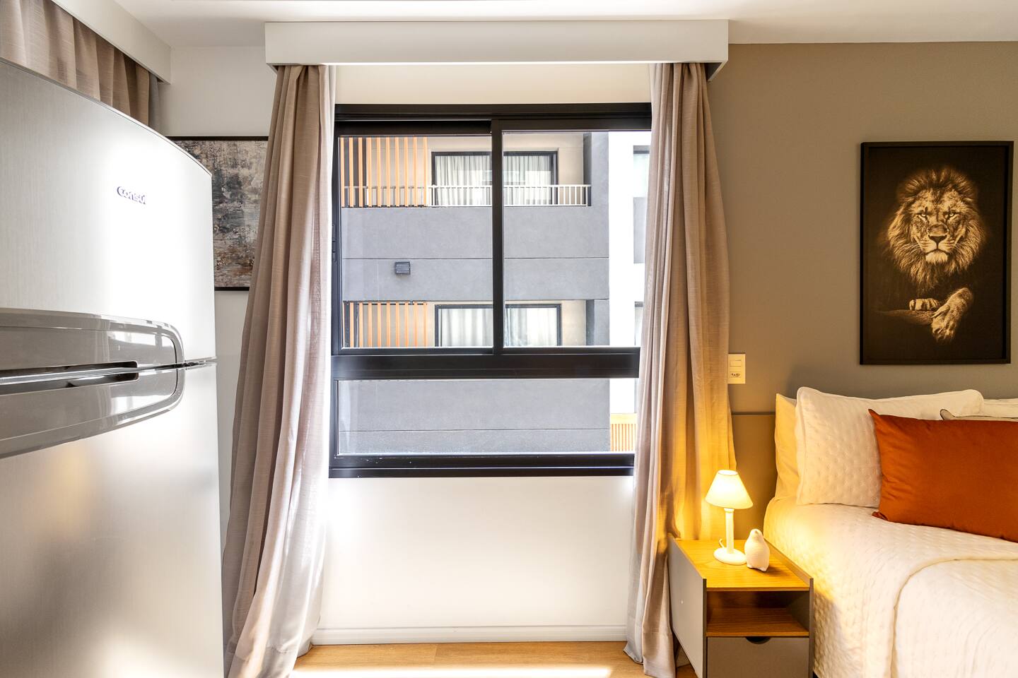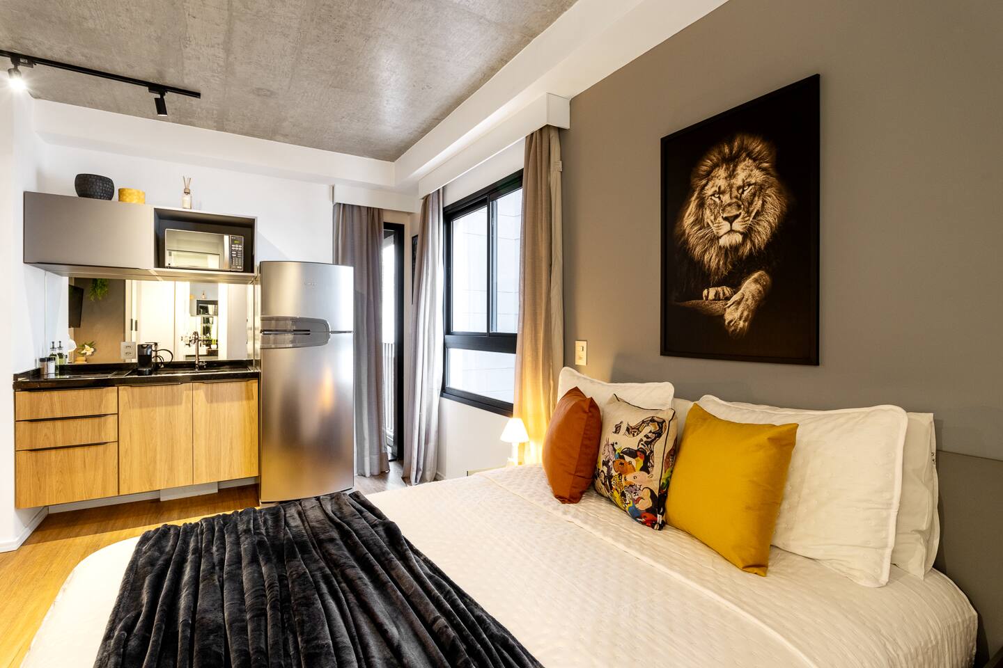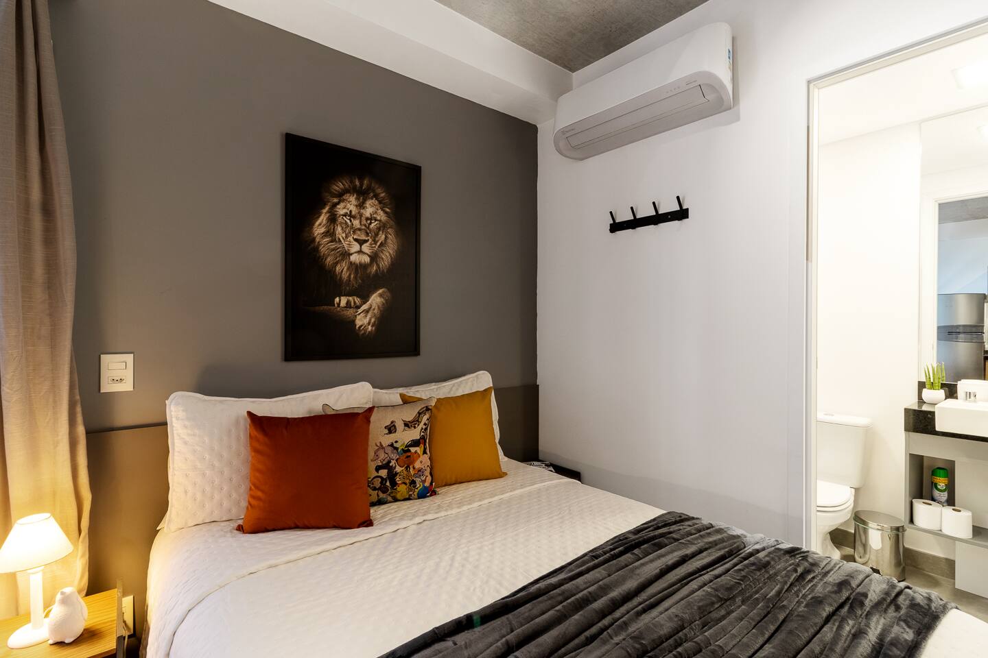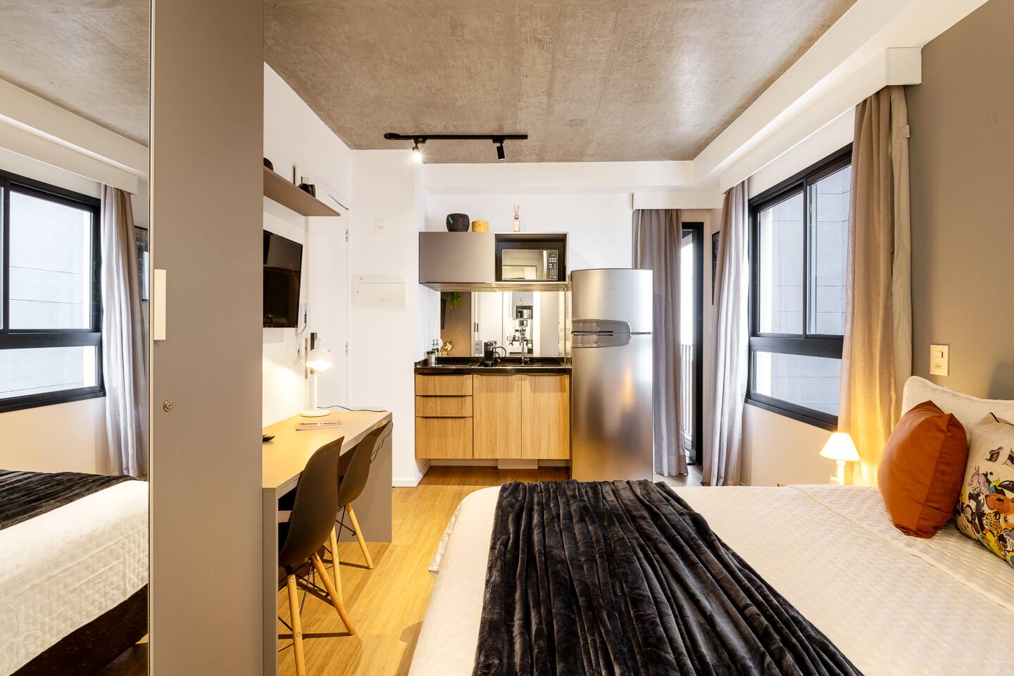 Welcome to your private headquarters in São Paulo. Though compact (25m²), this studio is intelligently designed to maximize comfort and functionality. Rest: Unwind on a high-quality Queen-size bed fitted with premium linens, ensuring a perfect night's sleep after a busy day. Work: A dedicated workspace and lightning-fast internet make this unit ideal for remote work or business calls. Living: The studio features a modern kitchenette, air conditioning for those warm tropical days, and a Smart TV for your evening entertainment.