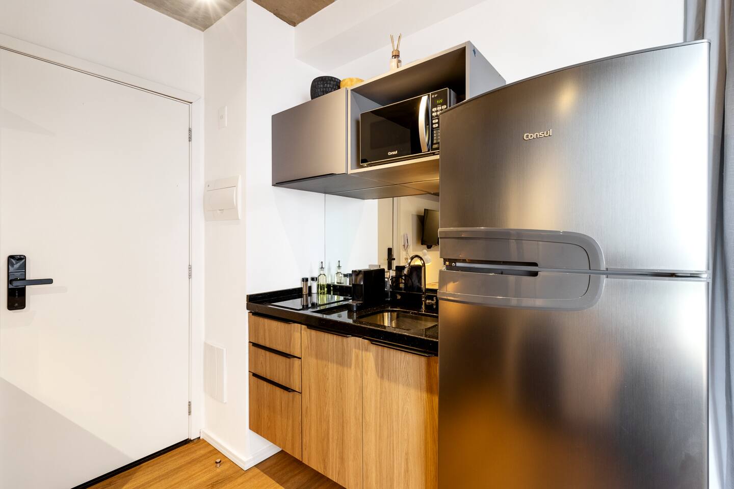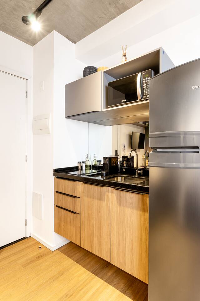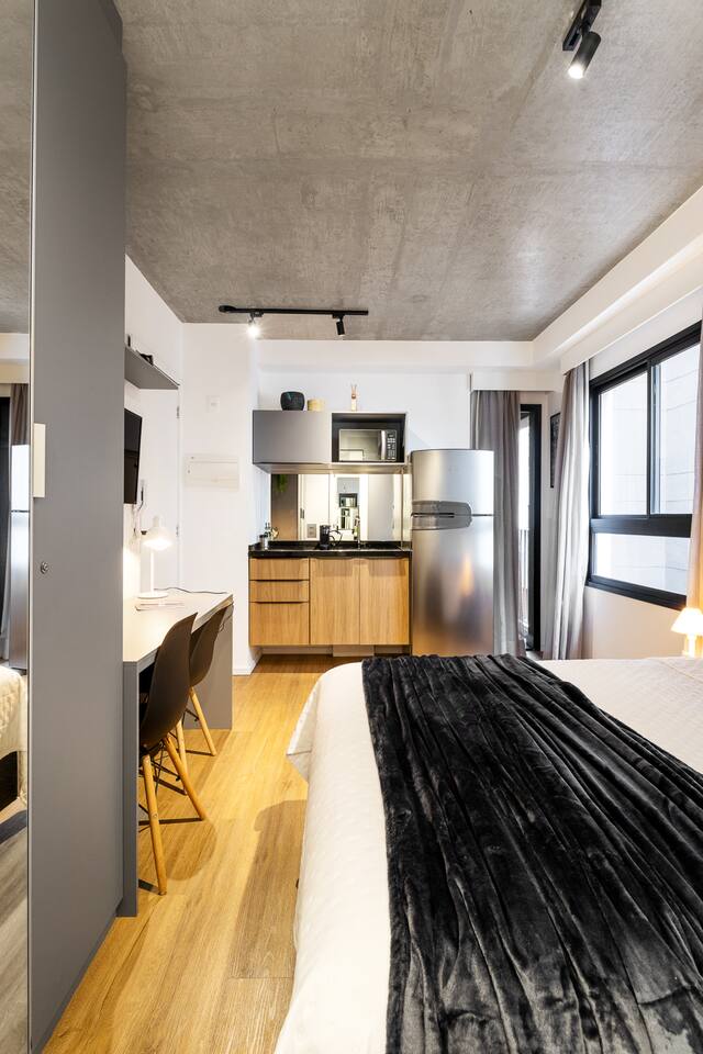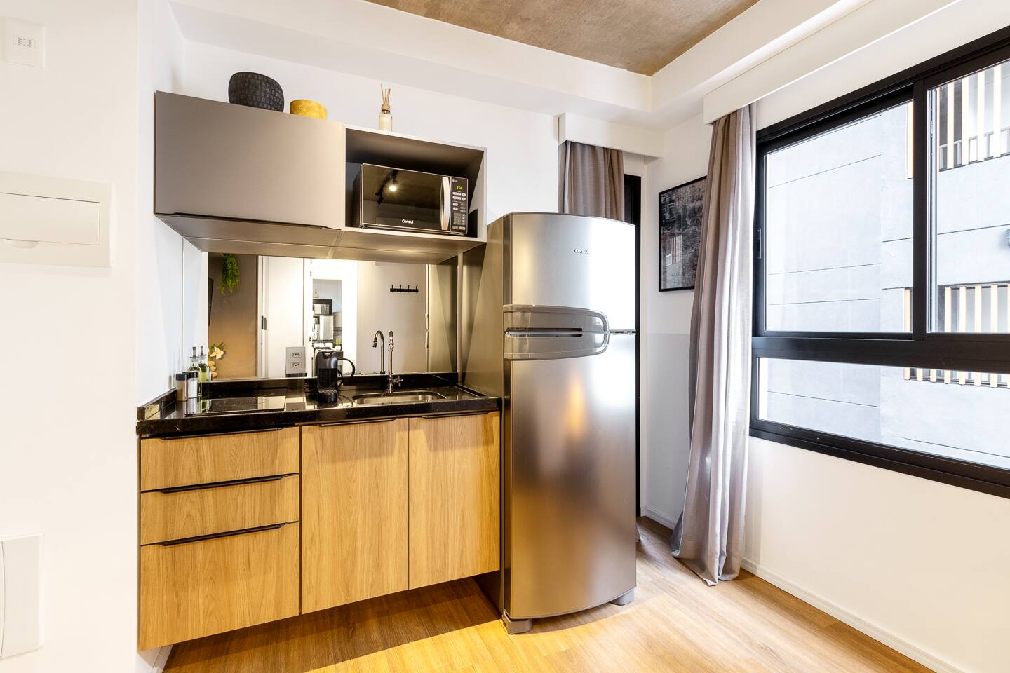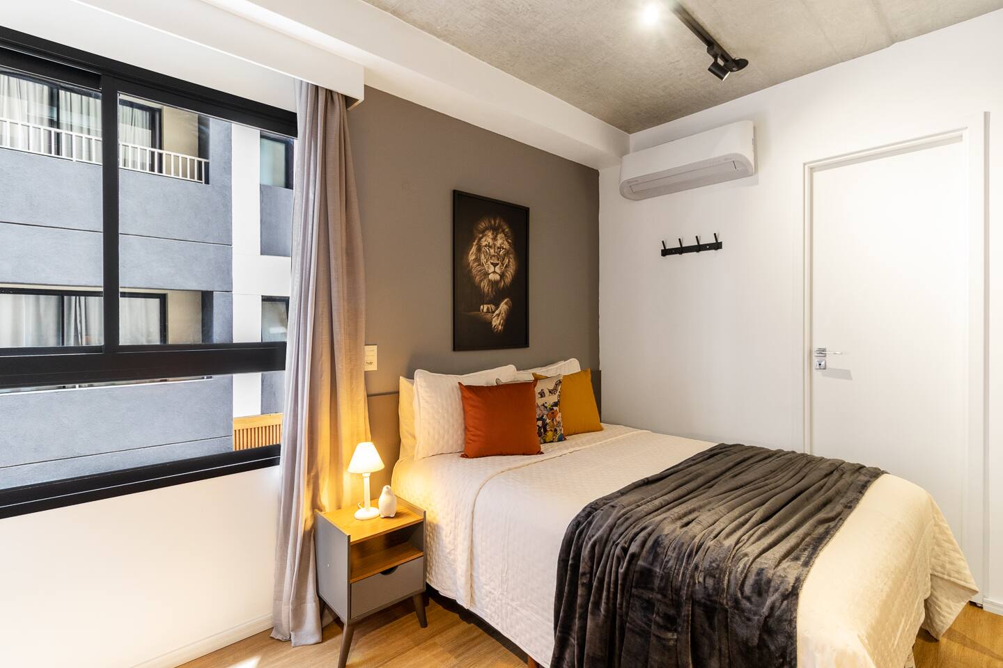 Welcome to your private headquarters in São Paulo. Though compact (25m²), this studio is intelligently designed to maximize comfort and functionality. Rest: Unwind on a high-quality Queen-size bed fitted with premium linens, ensuring a perfect night's sleep after a busy day. Work: A dedicated workspace and lightning-fast internet make this unit ideal for remote work or business calls. Living: The studio features a modern kitchenette, air conditioning for those warm tropical days, and a Smart TV for your evening entertainment.