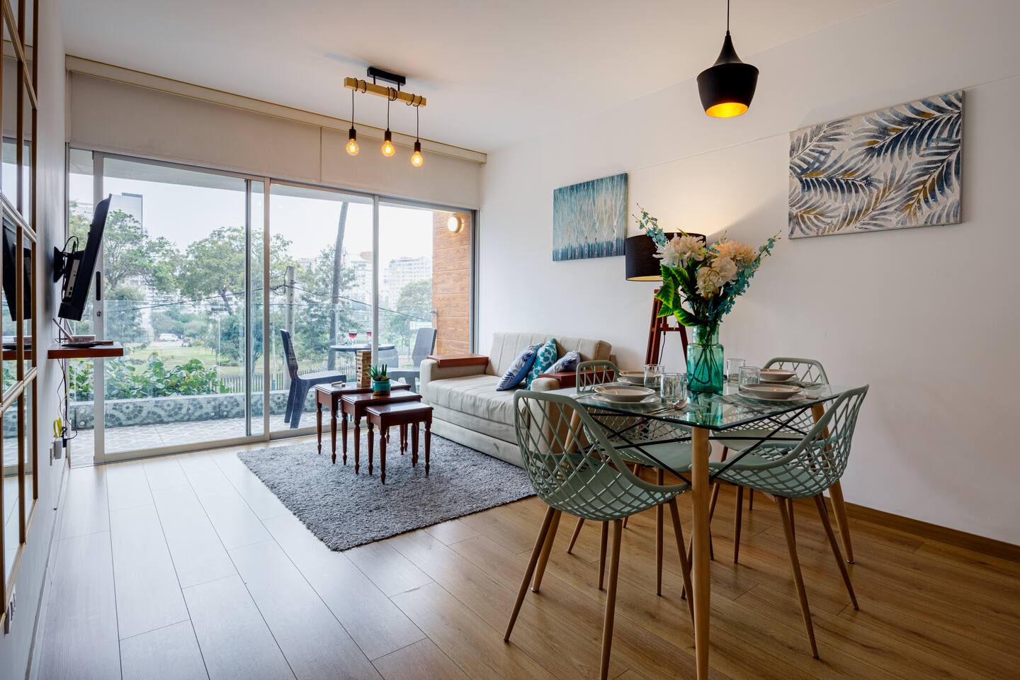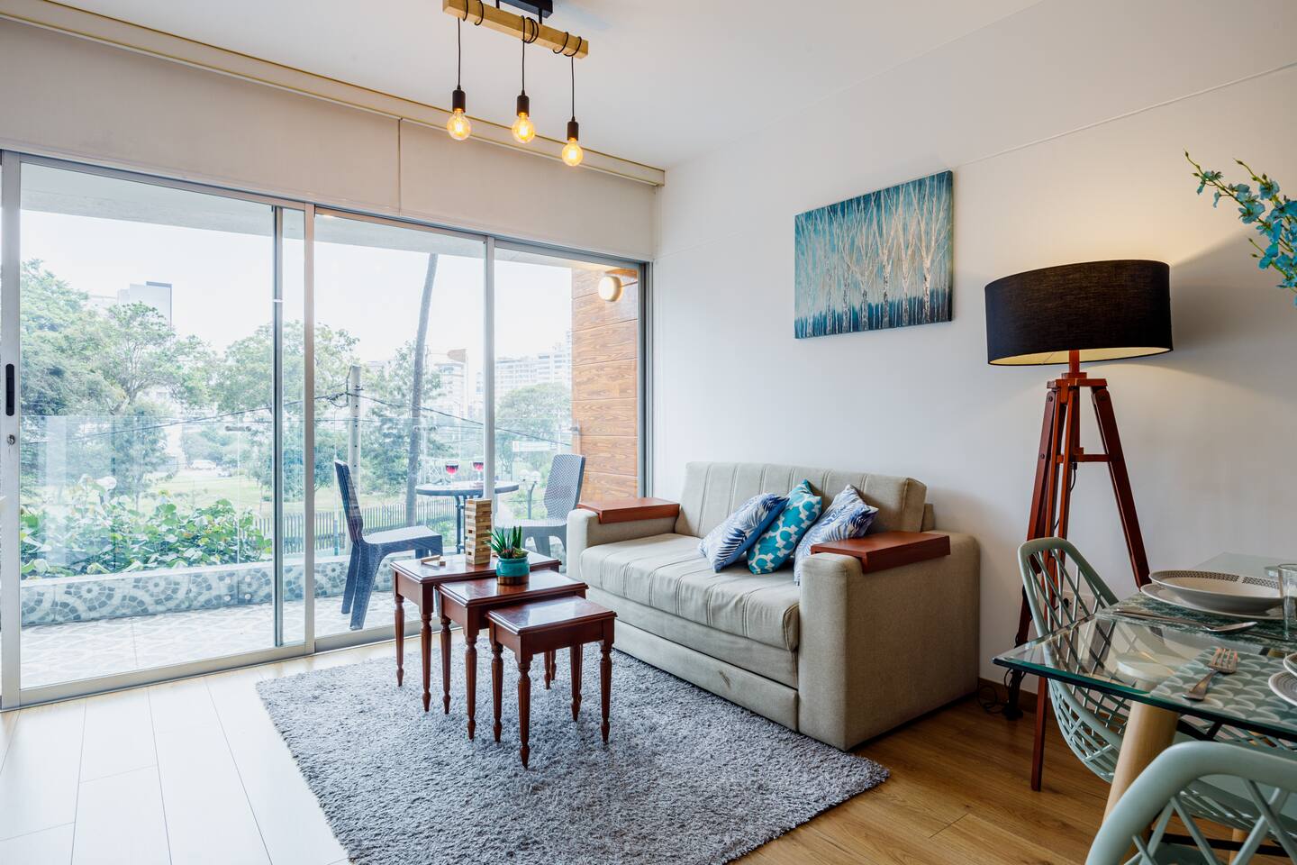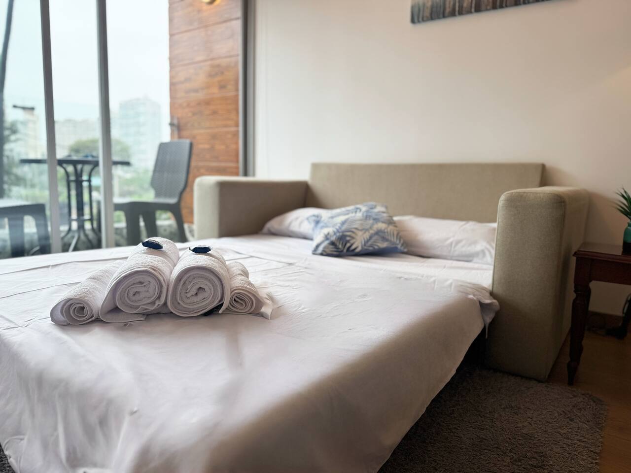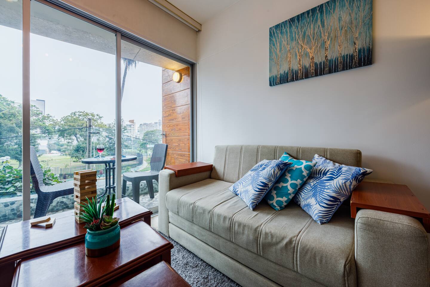 Moderno flat en Barranco en edificio exclusivo con piscina y gym. Vive la mejor experiencia en el distrito más vibrante de Lima, con vista al MAC desde tu balcón. Este espacio para 3 (cama Queen + sofá cama) está totalmente equipado para tu confort, incluyendo café y artículos de aseo premium. A solo pasos de las galerías, bares y restaurantes que hacen famoso a Barranco. ¡El hogar perfecto para tu romántica aventura!