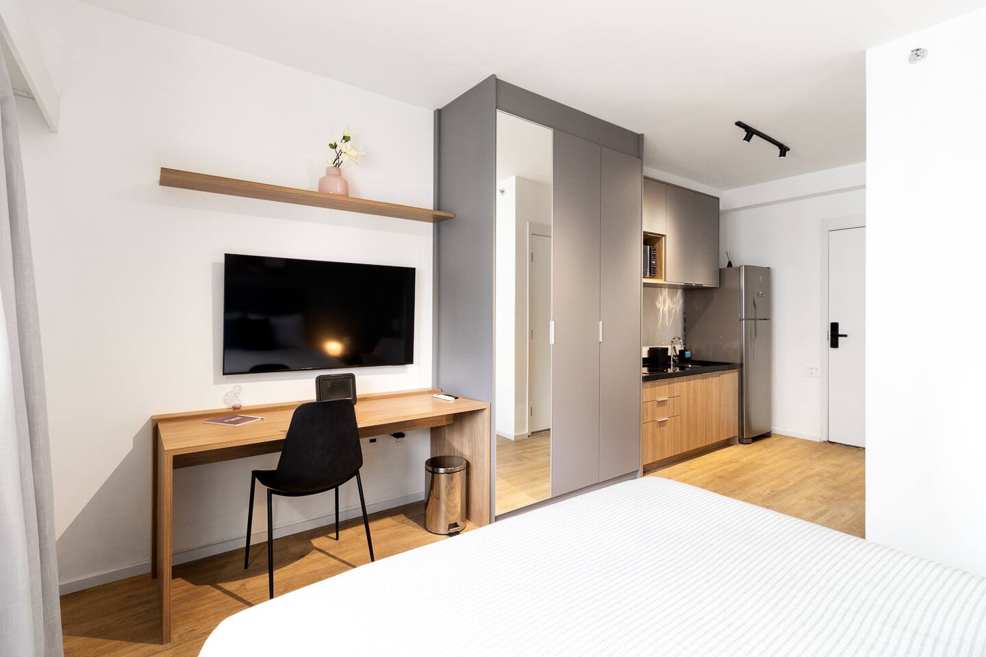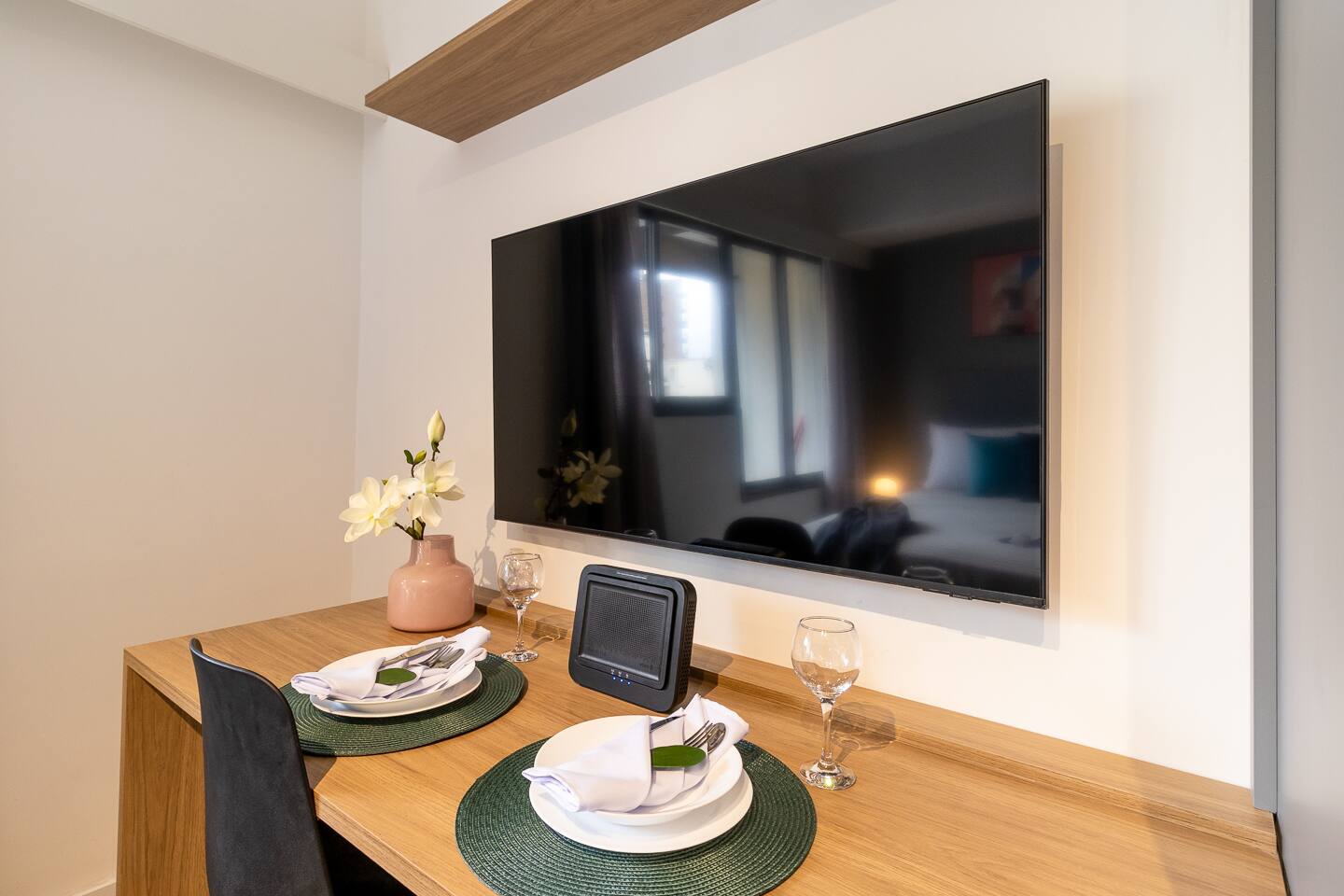 Where Function Meets Comfort We have optimized every inch of this modern studio to support your lifestyle. For Work: Power through your emails with our high-speed fiber optic Wi-Fi and a dedicated, comfortable workspace. The environment is quiet, bright, and conducive to focus. For Relaxation: Transition effortlessly into downtime. The studio features a plush Queen-size bed with premium linens, blackout curtains for deep sleep, and a Smart TV for your favorite series. The fully equipped kitchen allows for quick business breakfasts or intimate dinners at home.