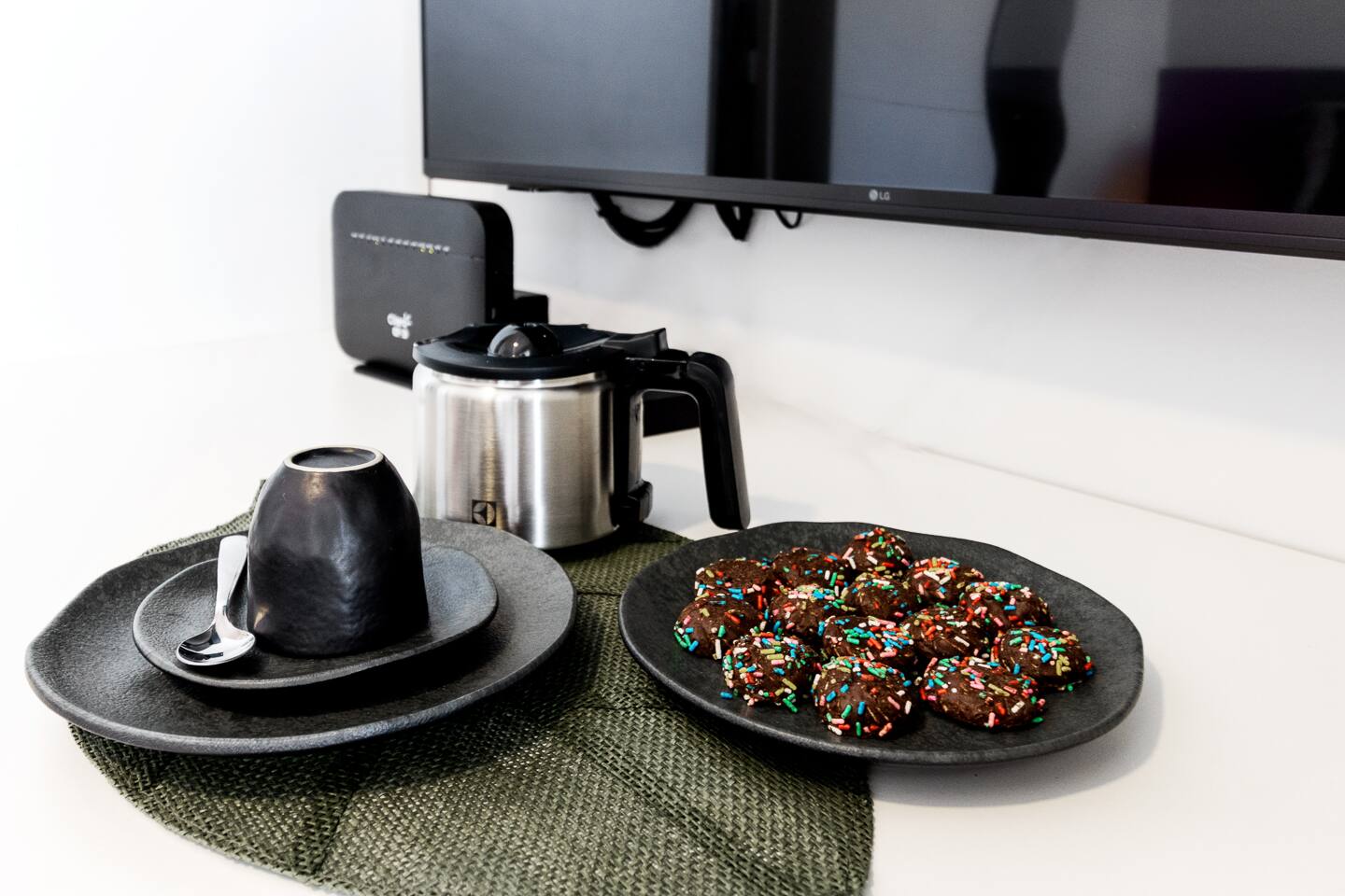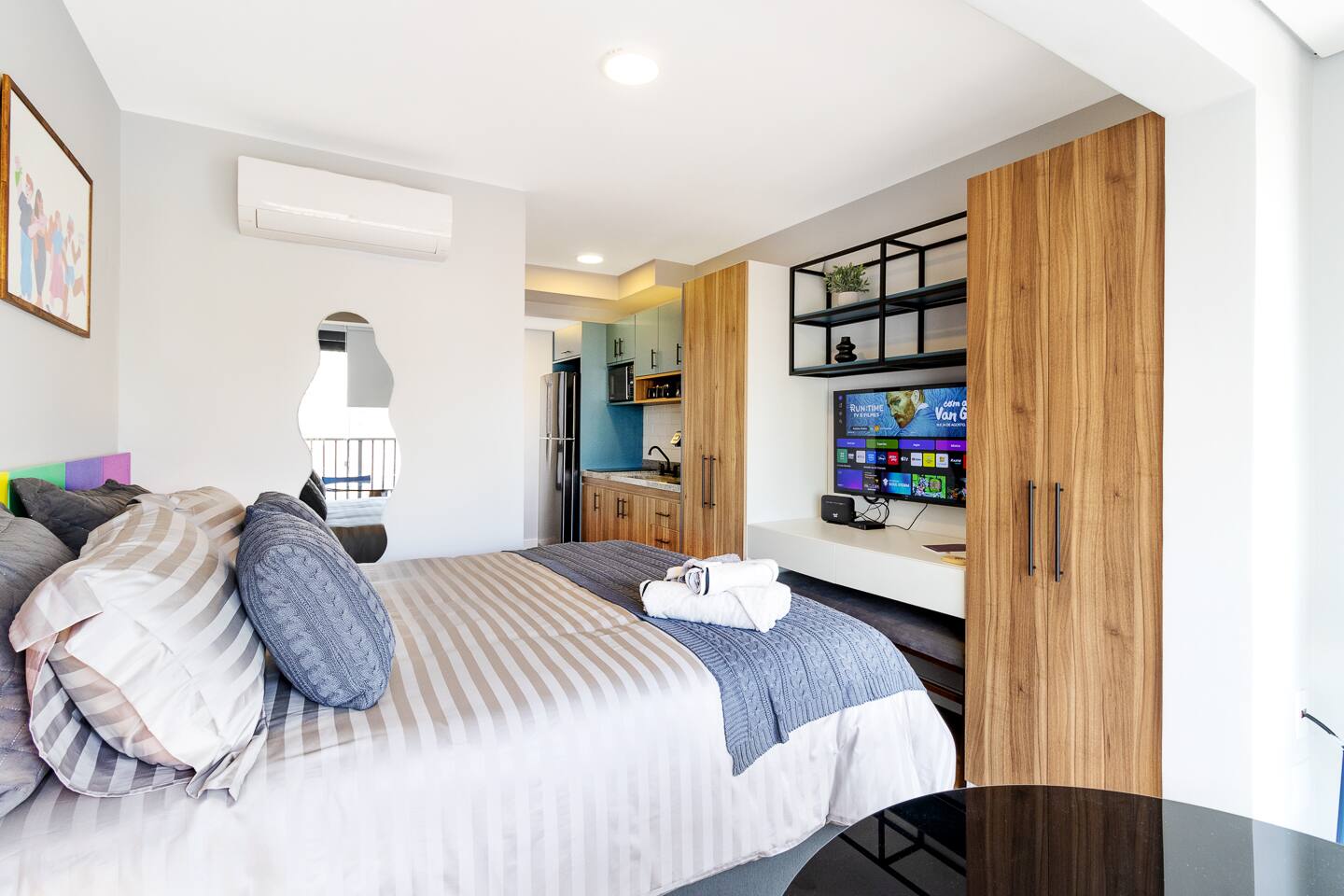 Preparamos um espaço com tudo o que você precisa para uma experiência de luxo, onde sua única preocupação será aproveitar a cidade. Descanso de Luxo: A peça central do studio é uma confortável cama queen-size, vestida com enxoval de hotelaria de alta qualidade, garantindo noites de sono revigorantes. Entretenimento Garantido: Relaxe com nossa Smart TV que já inclui acesso liberado para Netflix, Globoplay e HBO Max. Sua maratona de filmes e séries está pronta para começar! Cozinha Gourmet Completa: Prepare suas refeições com facilidade em uma cozinha moderna e funcional, equipada com cooktop, micro-ondas, frigobar, cafeteira, e um jogo completo de panelas, pratos, talheres e taças. Espaço Versátil: O studio conta com um escritório dedicado, perfeito para home office com nosso Wi-Fi de alta velocidade, e uma charmosa mesa para duas pessoas, ideal para suas refeições. Banheiro SPA: Um banheiro impecável com ducha de alta pressão e amenidades premium (shampoo, condicionador e sabonete) para seu total conforto. Toalhas macias também estão à sua espera.