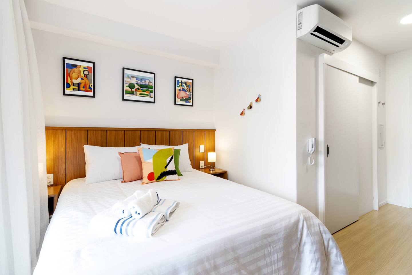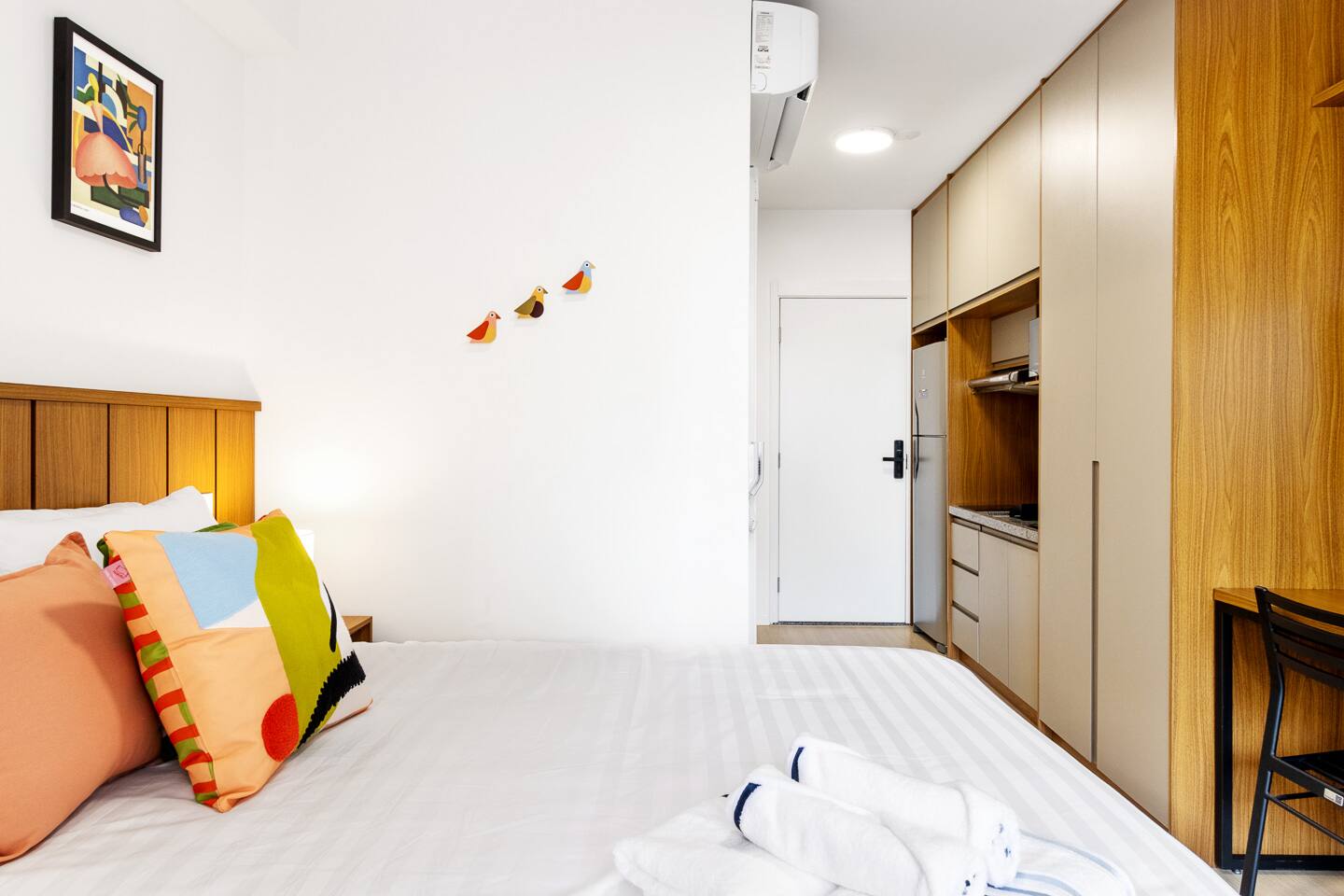 Step into a bright, air-conditioned studio featuring a private balcony with seating for three—ideal for morning coffee or evening drinks. The sleeping area boasts a Queen bed with luxurious 400-thread count cotton linens. Need to catch up on emails? The balcony table serves as an inspiring workspace with natural light and fresh air. The modern bathroom and high-pressure shower are perfect for recharging after a long commute.